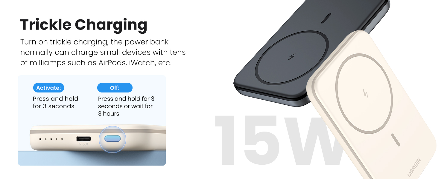 - Exit Trickle Charging Mode: Press and hold for about 3 seconds or wait for 3.5 hours